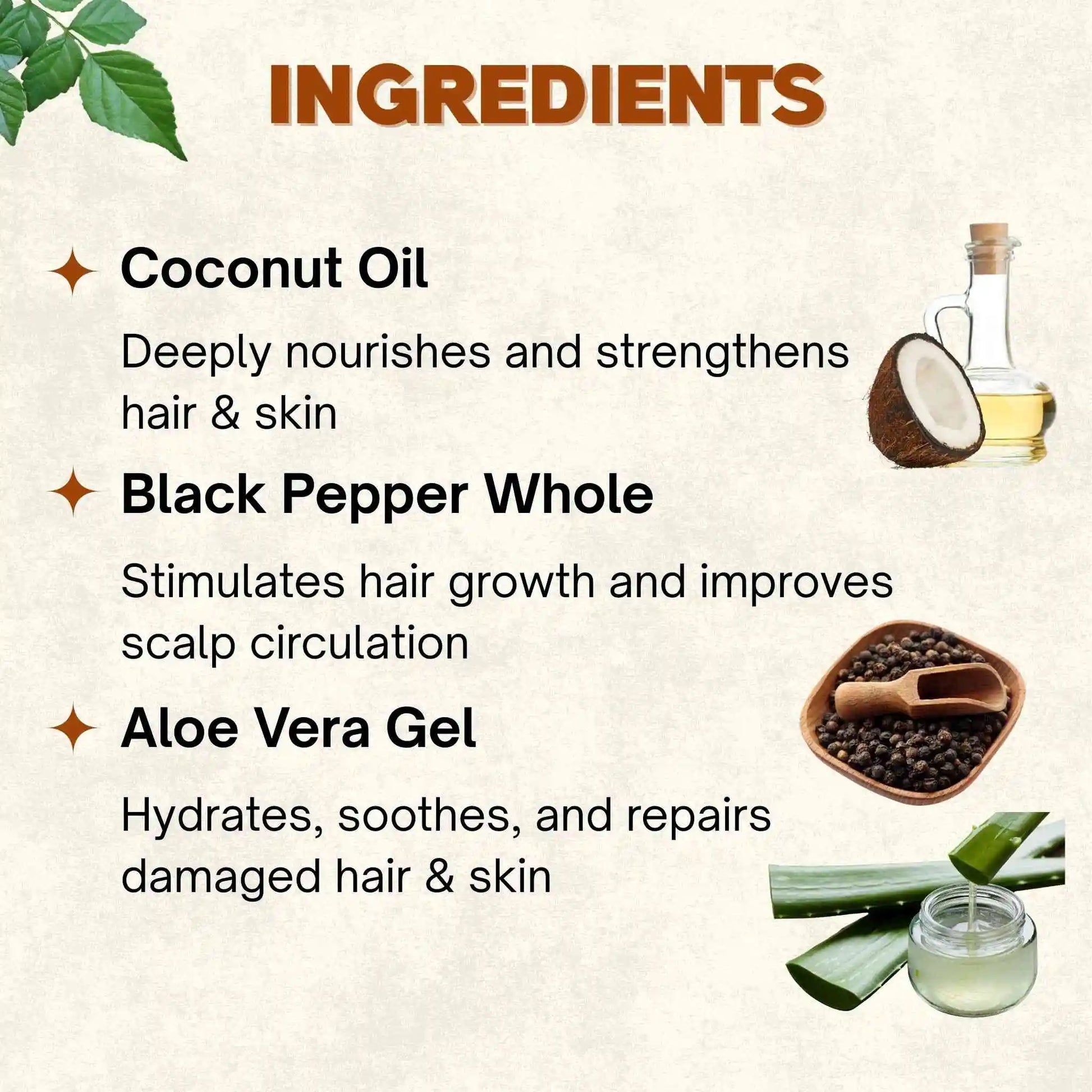 ✔ Coconut Oil – Deeply nourishes and strengthens hair & skin.