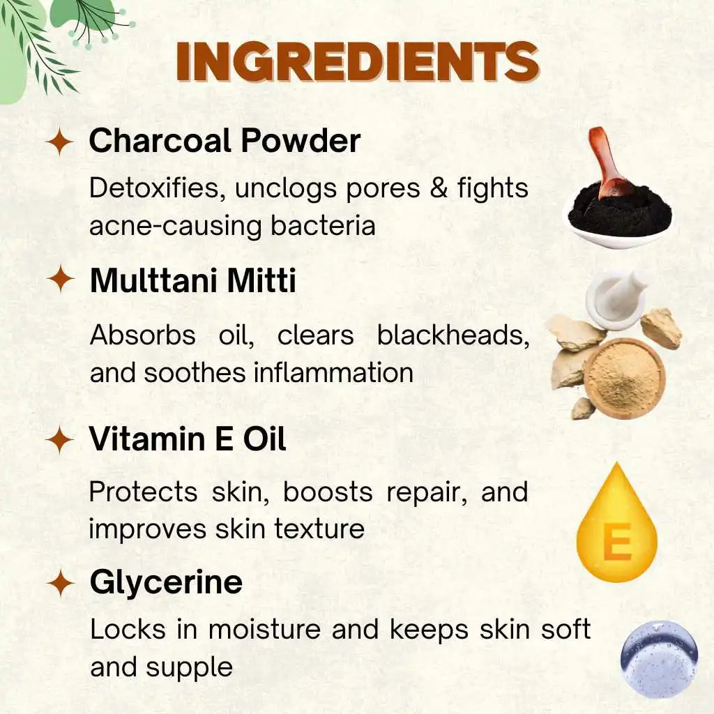 ✔ Charcoal Powder – Deep cleanses pores, controls acne, and removes buildup.