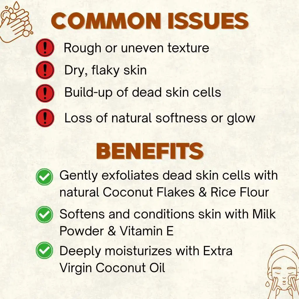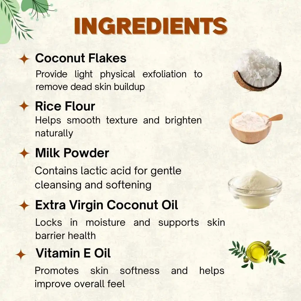 ✅ Gently exfoliates dead skin cells with natural Coconut Flakes & Rice Flour