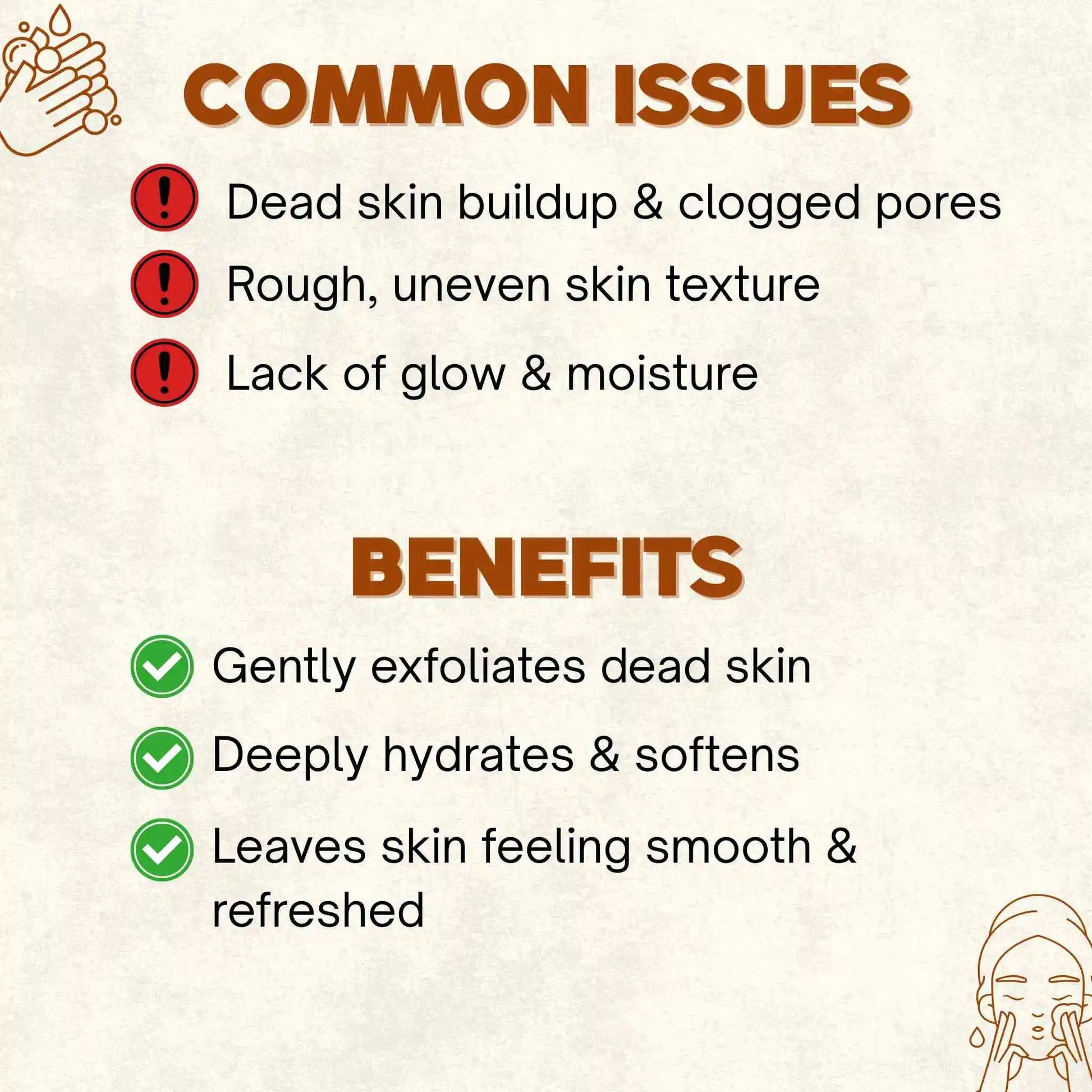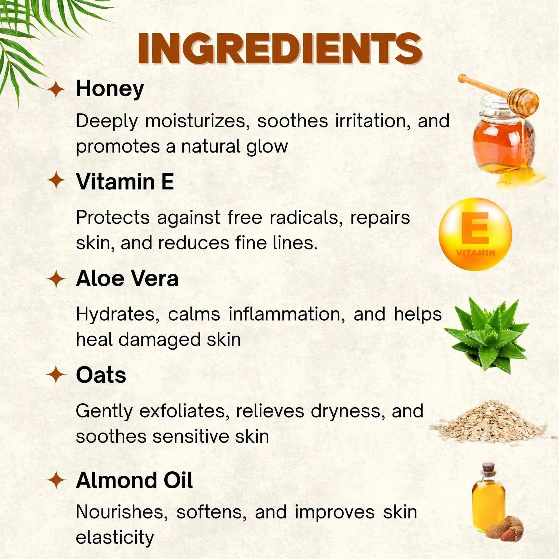 ✔ Oats – Gently exfoliates, relieves dryness, and soothes sensitive skin.