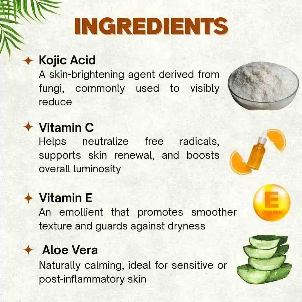 ✔ Kojic Acid – A skin-brightening agent derived from fungi, commonly used to visibly reduce pigmentation over time