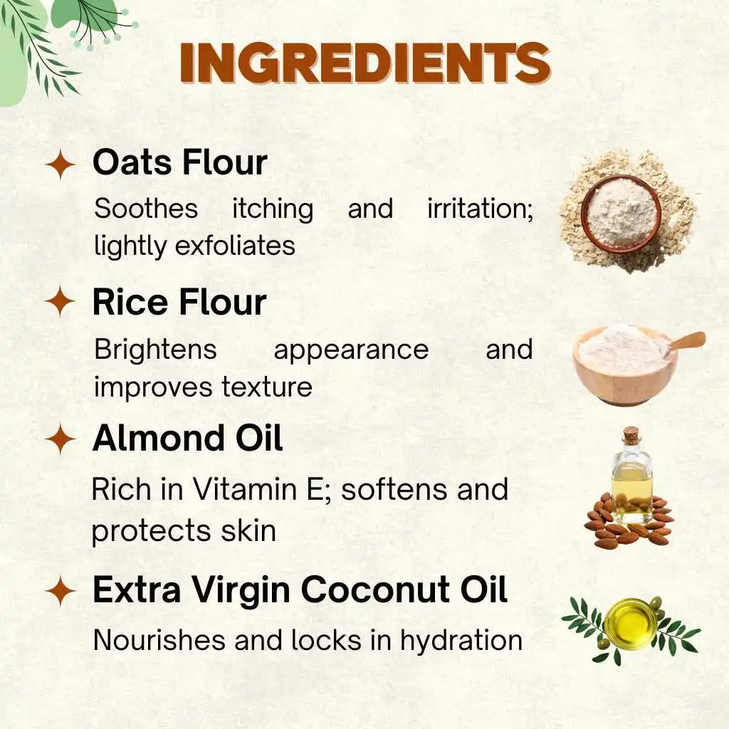 ✔ Oats Flour – Soothes itching and irritation; lightly exfoliates